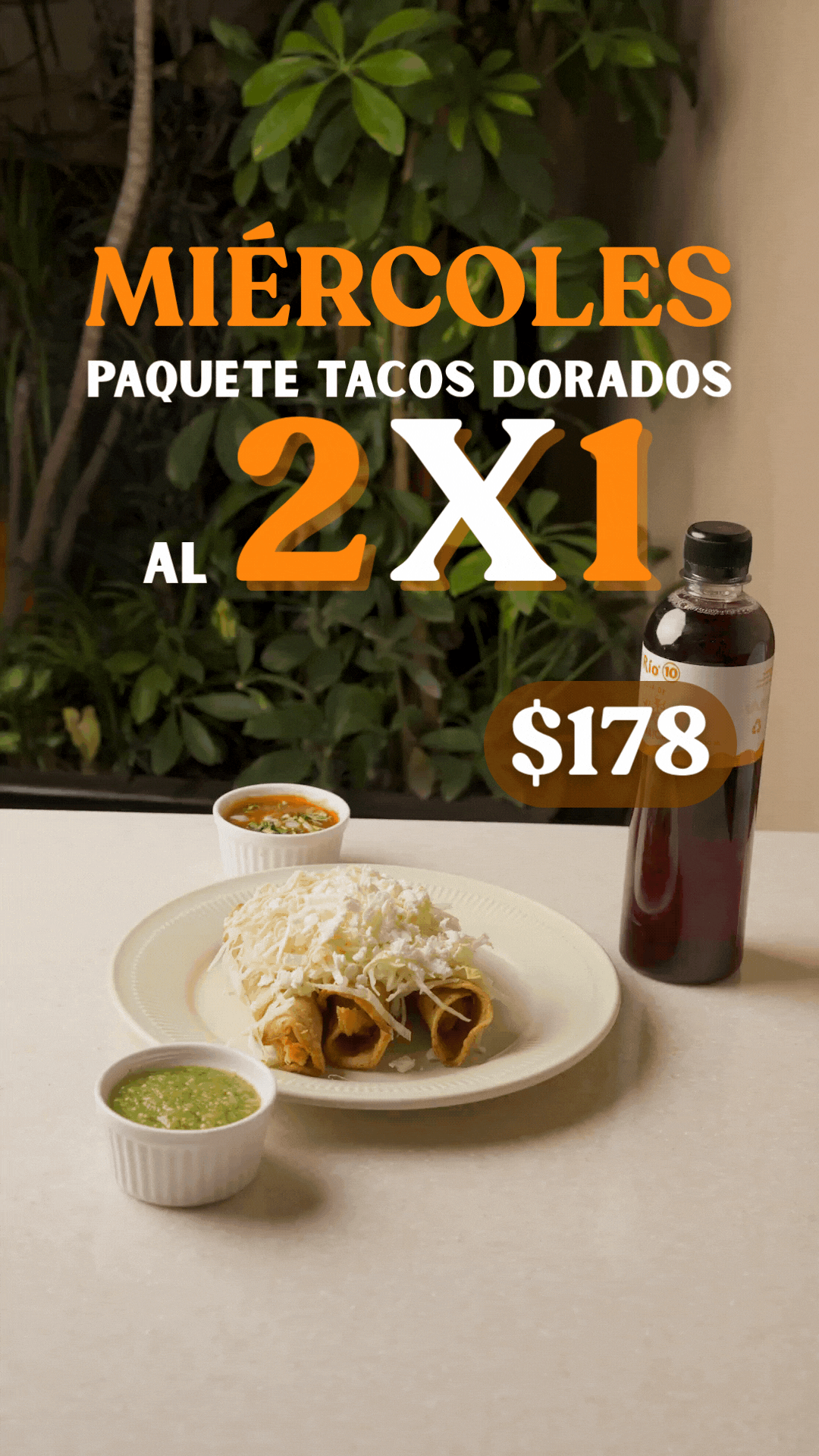 Promo miércoles rosticeríaPaquete de tacos dorados al 2×1 El paquete incluye: 3 tacos dorados de pollo, una agua fresca (500 ml) y salsa verde o roja (60 ml).